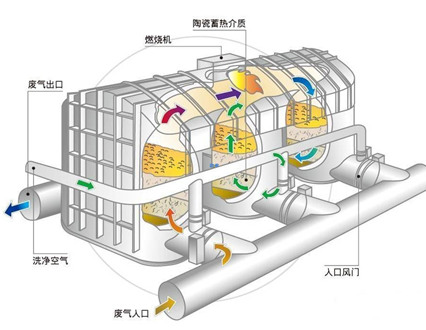 RTO主體結(jié)構(gòu)由燃燒室、陶瓷填料床和切換閥等組成。該裝置中的蓄熱式陶瓷填充床換熱器可使熱能得到回收,熱回收率大于95%,處理VOC時(shí)不用或使用很少的燃料。